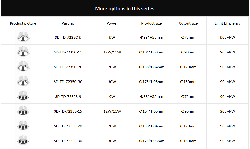 | LED chip | COB/SMD | Reflector | Matt Black & White/Chromed Black & Silver | ||||